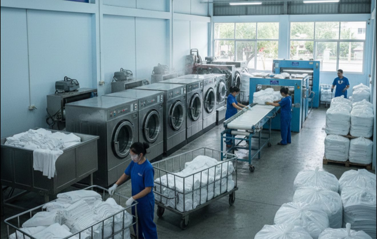 ผู้เชี่ยวชาญด้านบริการซักผ้าอุตสาหกรรมครบวงจร มาตรฐานสูง สะอาด ปลอดภัย ตรงเวลา รับส่งฟรี
